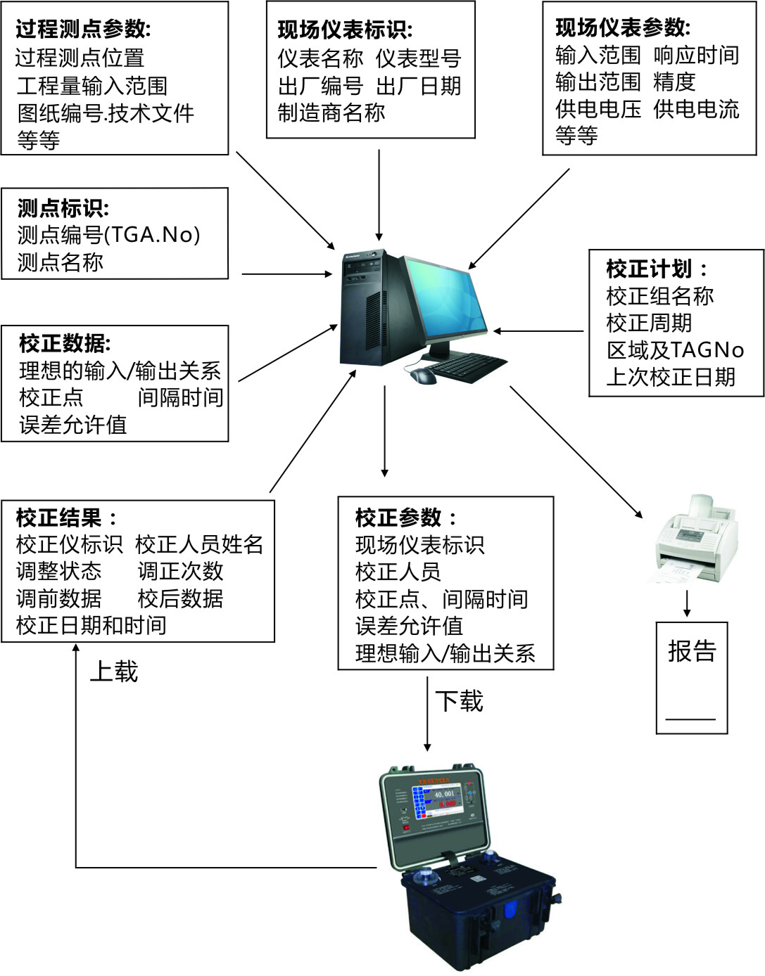 现场全自动压力检定系统:适合在现场应用,通过自动检定软件把需检定的现场仪表参数下载到手持校验仪里,在检定过程中,校验仪自动把数据记录在内存中,检定好后,把检定结果上载回自动检定软件进行数据处理和报告打印。